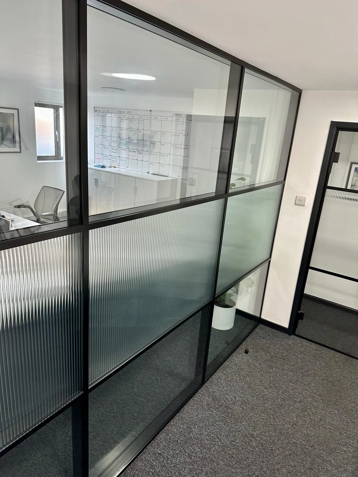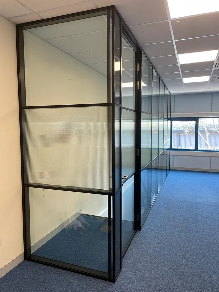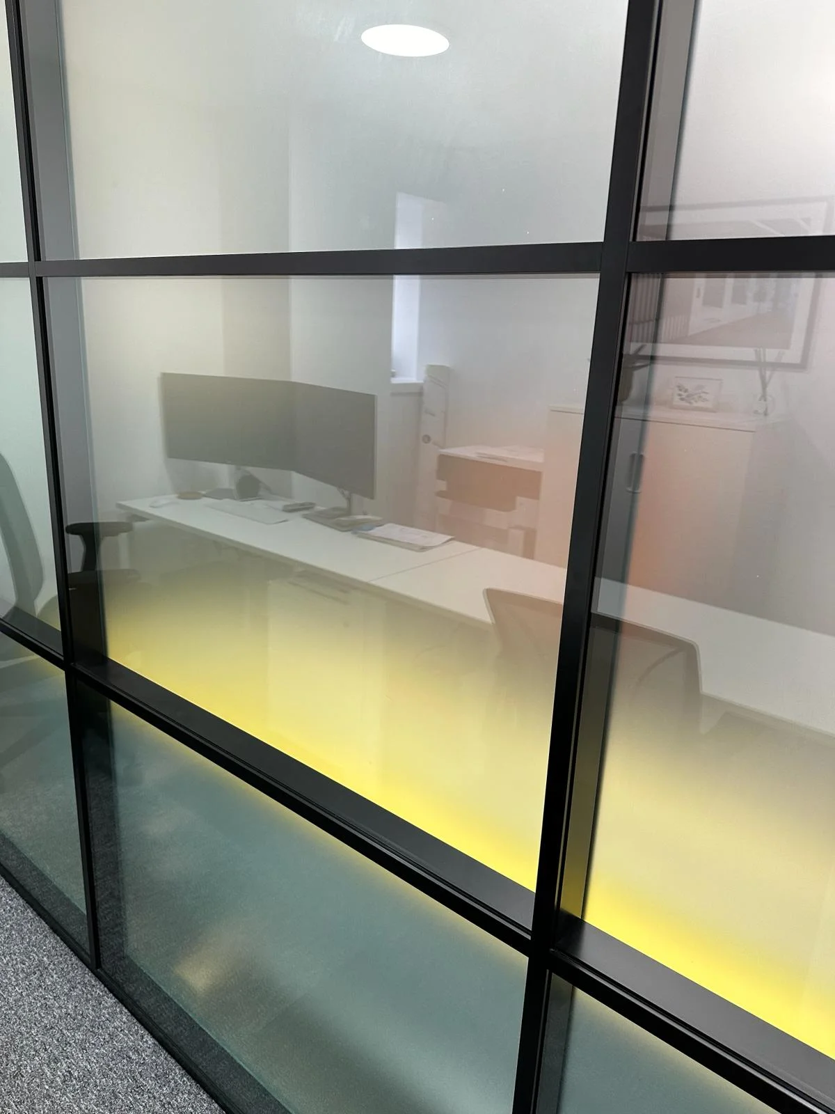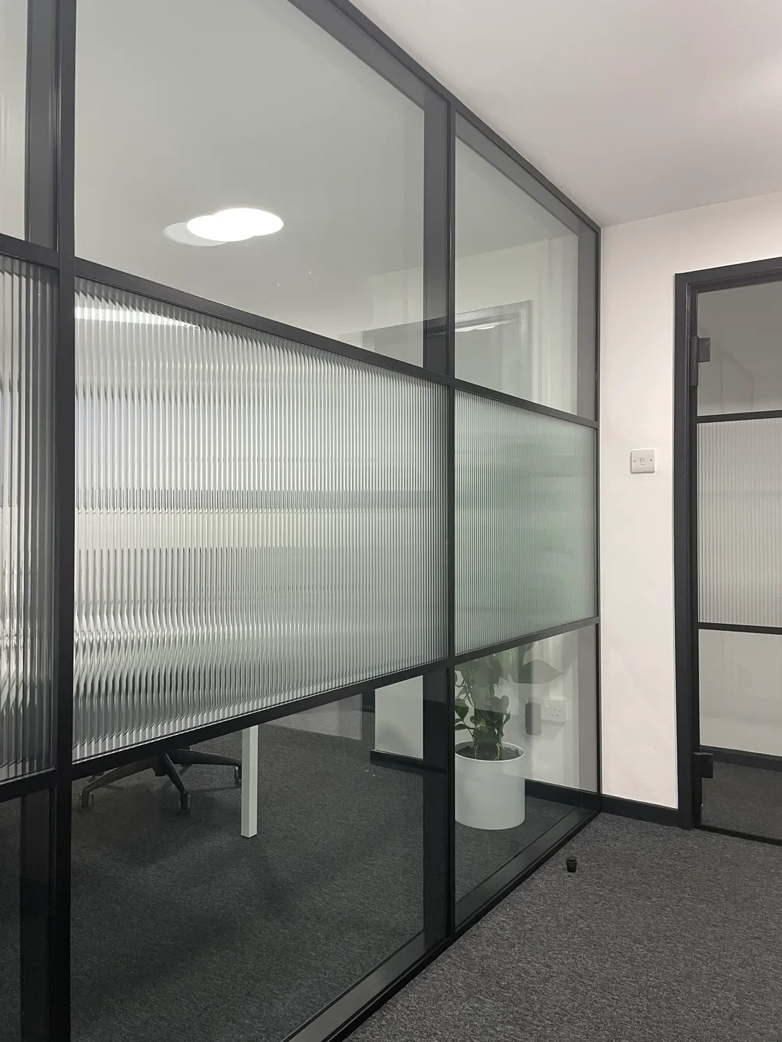 When installed, it is flush to the trackwork for enhanced aesthetics. The aluminium bar measures 25mm wide by 6mm thick and is bonded to the external faces of the glass using double-sided foam tape. The box section measures 59mm wide by 25mm thick, and is bonded internally to the glass. This works in conjunction with our aluminium bars to create a fully banded screen with a framed appearance, offering a sleek, professional finish within the 100mm aluminium frame system.