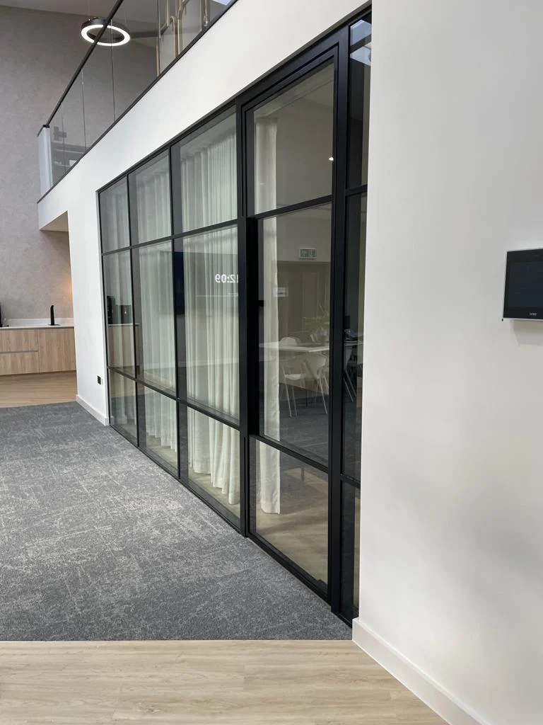 Banded screens can be complemented by a banded on-site glass door. This is achieved using 16mm x 1.6mm ‘U’ channel and 25mm x 1.6mm flat bars, which are part of the modular aluminium frame system, ensuring a cohesive design.